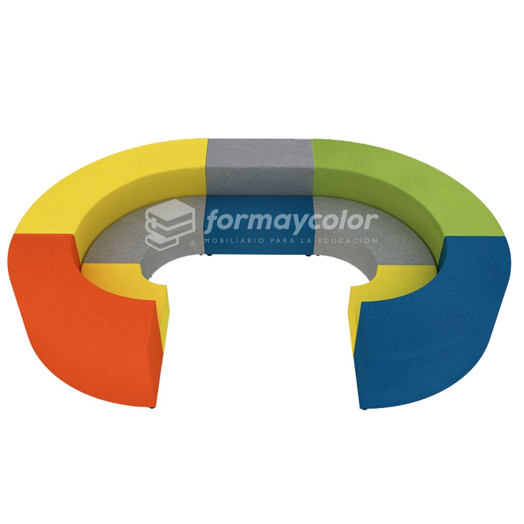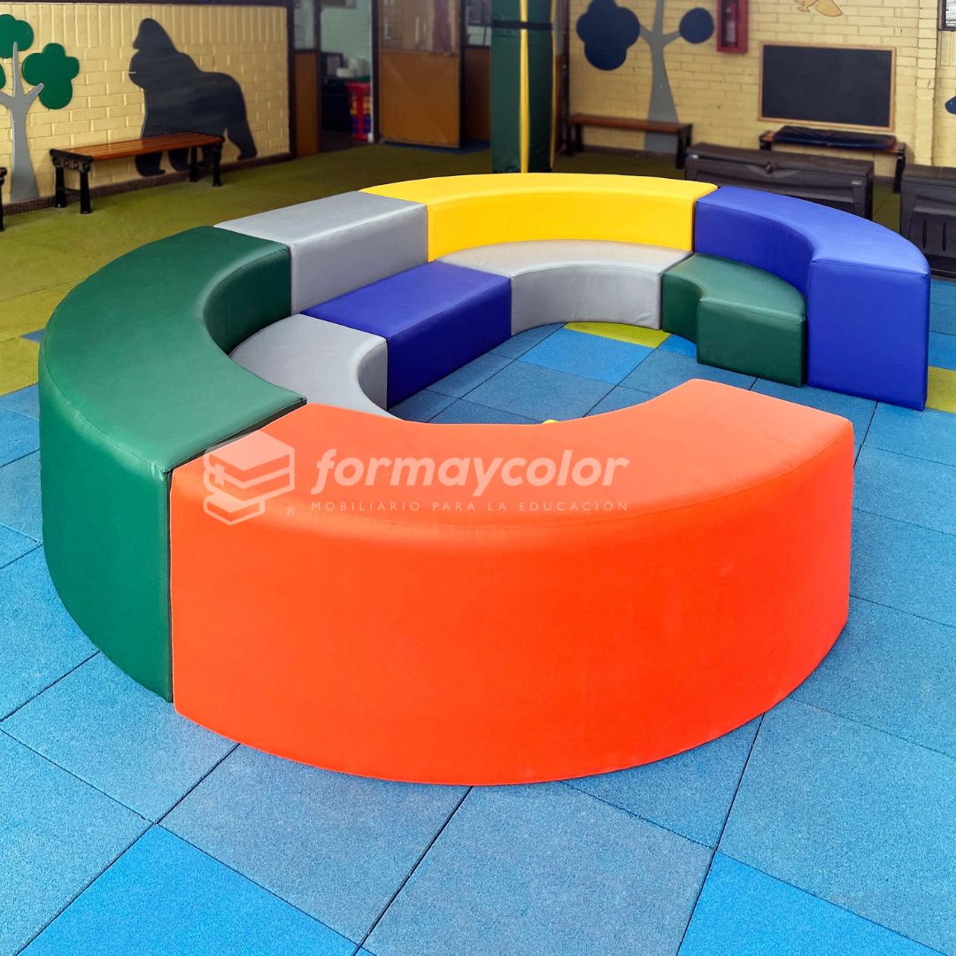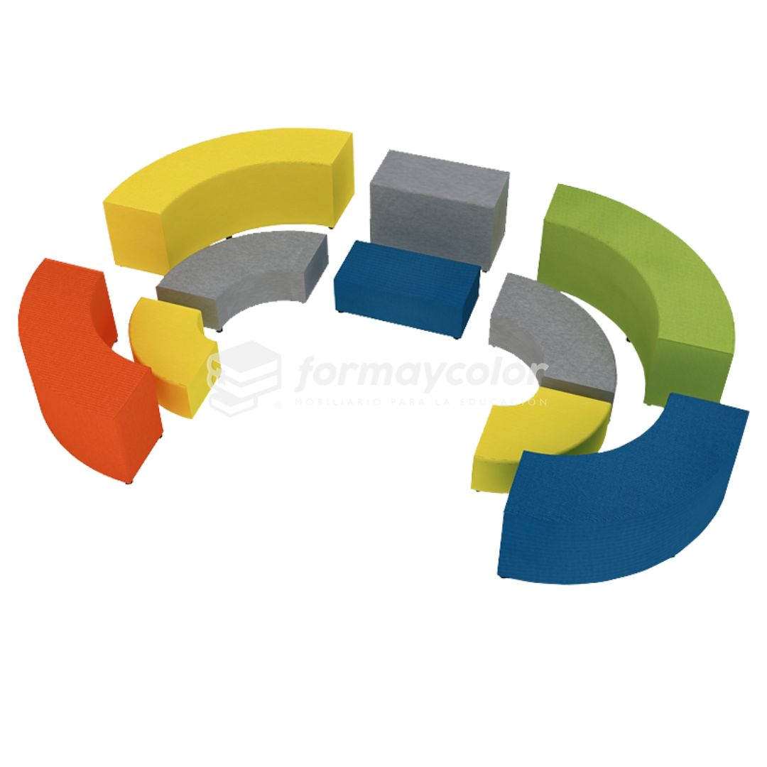 Anfiteatro modular Soft. Para niveles de transición y primeros niveles de enseñanza básica. Estructura MDF 15mm y perímetro 3,5 mm | Forrado en espuma de alta densidad perímetro 1cm y asiento 5 cm. Tapizado en tela lavable resistente a los rayos UV.
