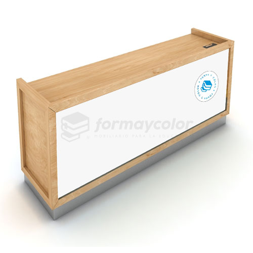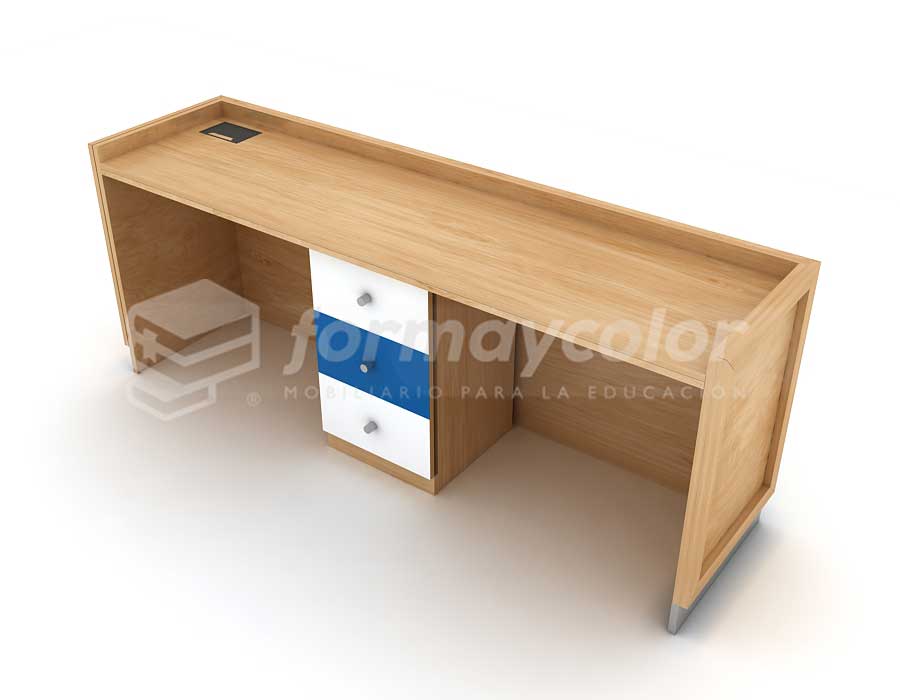 Confeccionado en madera terciada de 18 mm de espesor. Barnizado natural mate, no tóxico. Considera aplicaciones de fórmica, color a elección. Zócalo con acero inoxidable. Incluye cajonera de 3 cajones. Puede considerar logo de la institución en el frente (lámina auto adhesiva).