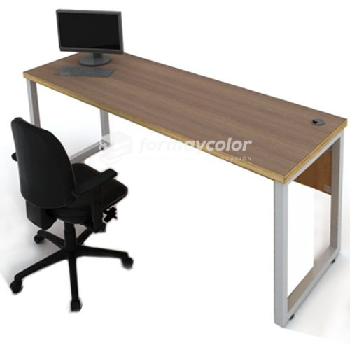 Escritorio de oficina, base metálica termo esmaltada, color gris perla. Marco con perfíl 40 x 40 x 1,5mm y travesaños con perfil rectangular 40 x 20 x 1,5 mm. Cubierta de madera terciada de 18 mm con enchape fórmica y regrueso perimetral de 36mm. No incluye cajonera.