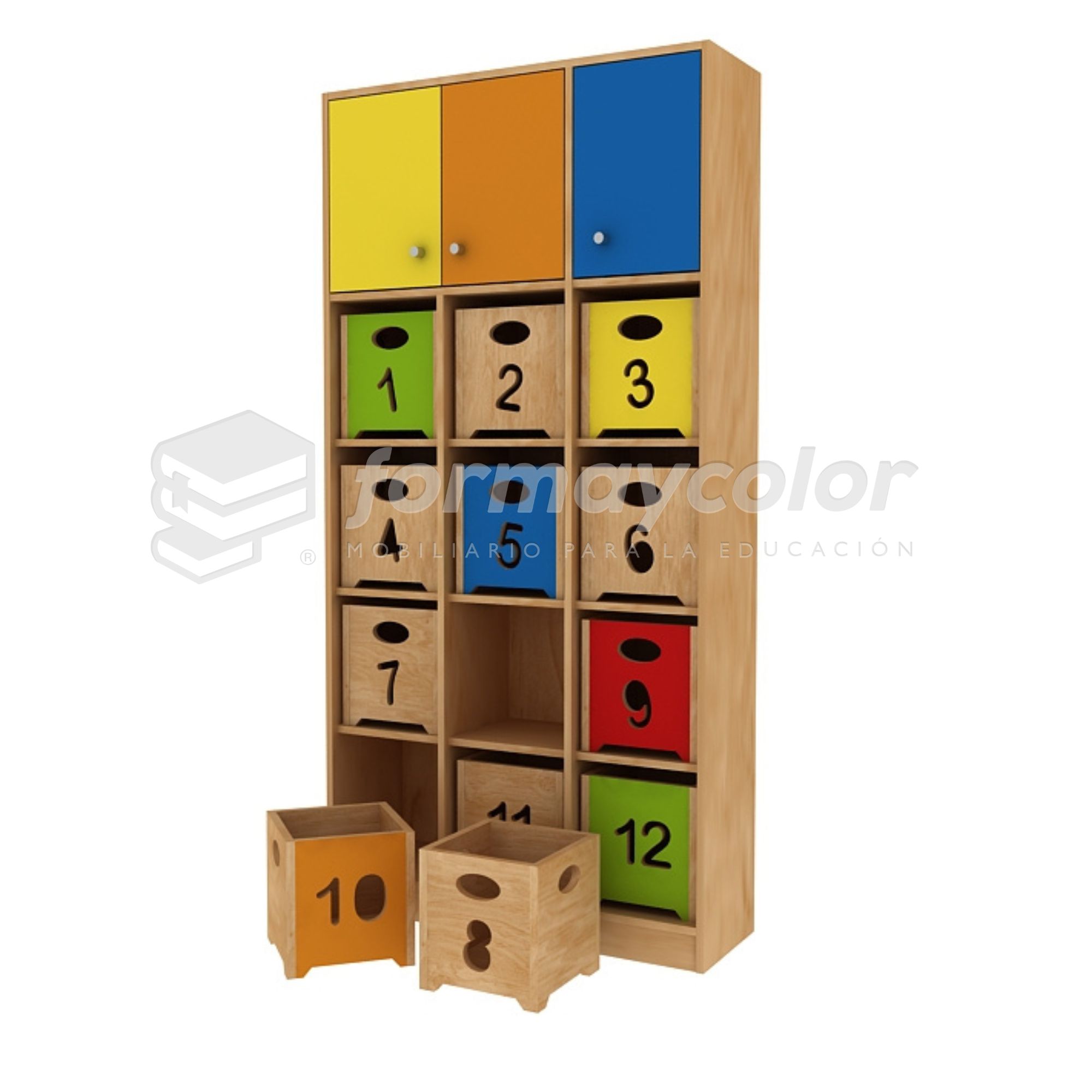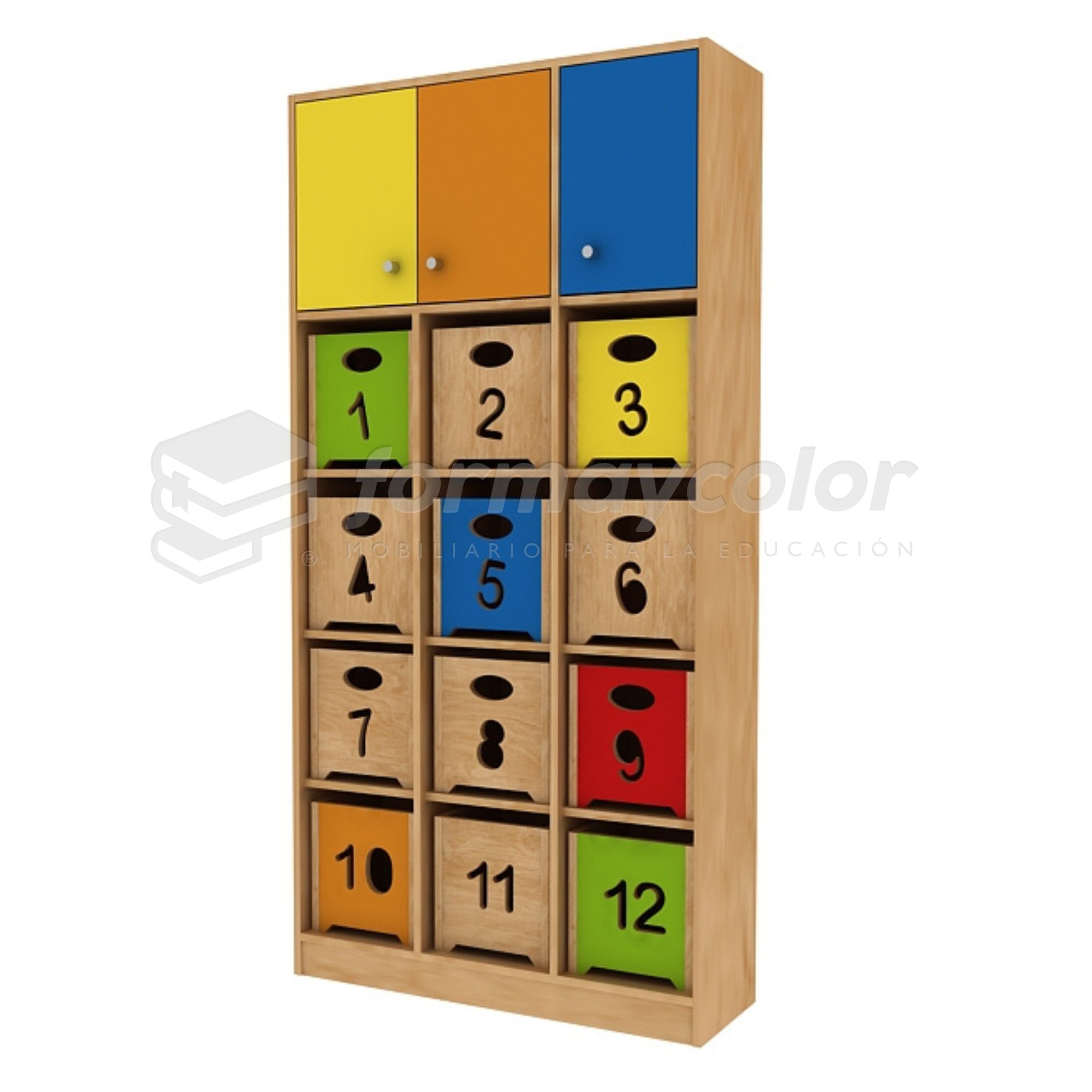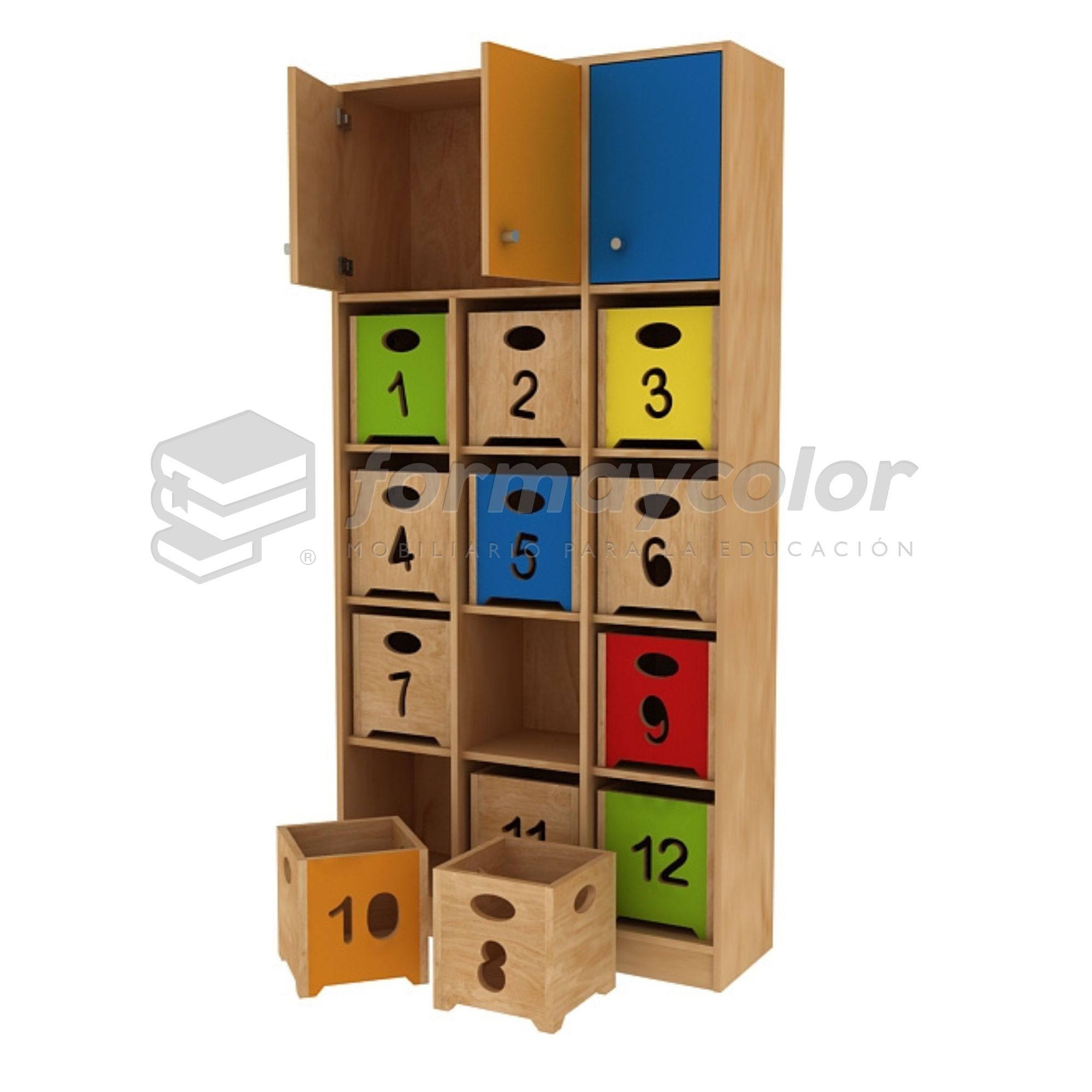 Estante con Cajones Extraibles Numerados, cuenta con 12 cajones extraibles numerados del 1 al 12 de los cuales 6 tienen color en el frente, con puertas en la parte superior