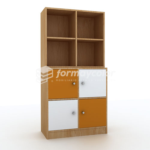 Estante utilero. Estructura confeccionada en madera terciada de 18 mm de espesor, trasera de madera terciada. Barniz natural mate. Base cuatro puertas (sin cerradura) con aplicaciones de formica color.