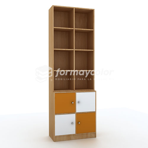 Estante utilero. Estructura confeccionada en madera terciada de 18 mm de espesor, trasera de madera terciada. Barniz natural mate. Base cuatro puertas (sin cerradura) con aplicaciones de formica color.