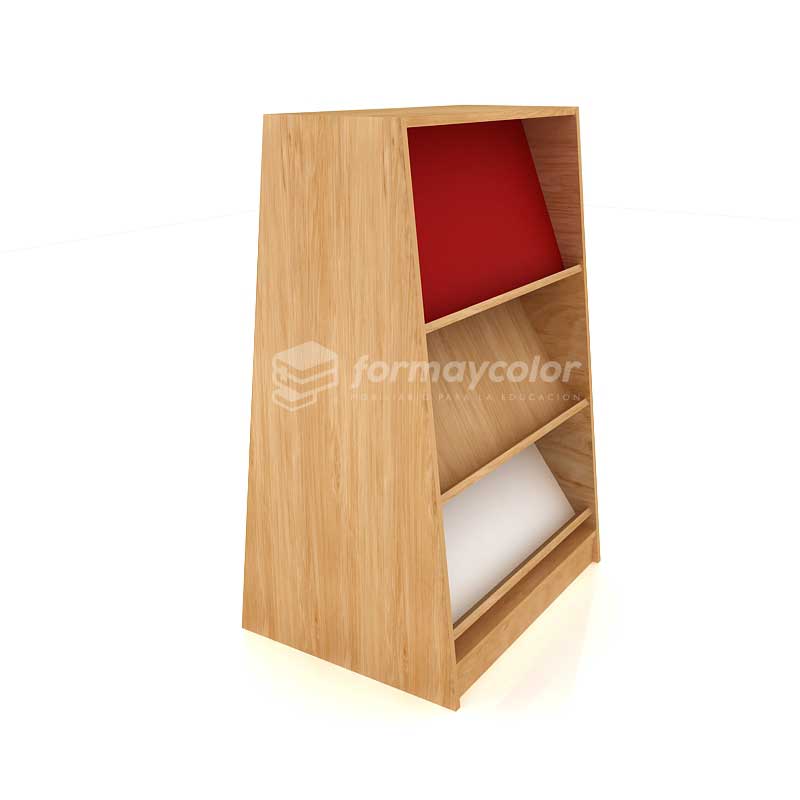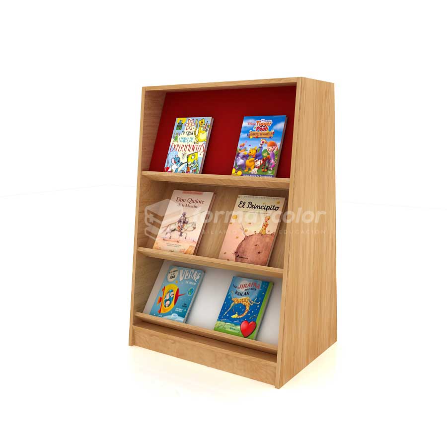 Exhibidor de libros dos caras. Confeccionado en madera terciada de 18 mm de espesor. Barnizado natural mate, no tóxico. Considera aplicaciones de fórmica, color a elección.